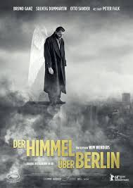 Berlin, the 1980s. Angels played by Bruno Ganz and Otto Sander are at their preferred location of the Siegessäule (Victory Column), looking down on the Brandenburg Gate with the Alexanderplatz television tower and the East visible in the background. They wear ponytails and a pair of wings is peeking out of Ganz’s standard issue long black jacket.